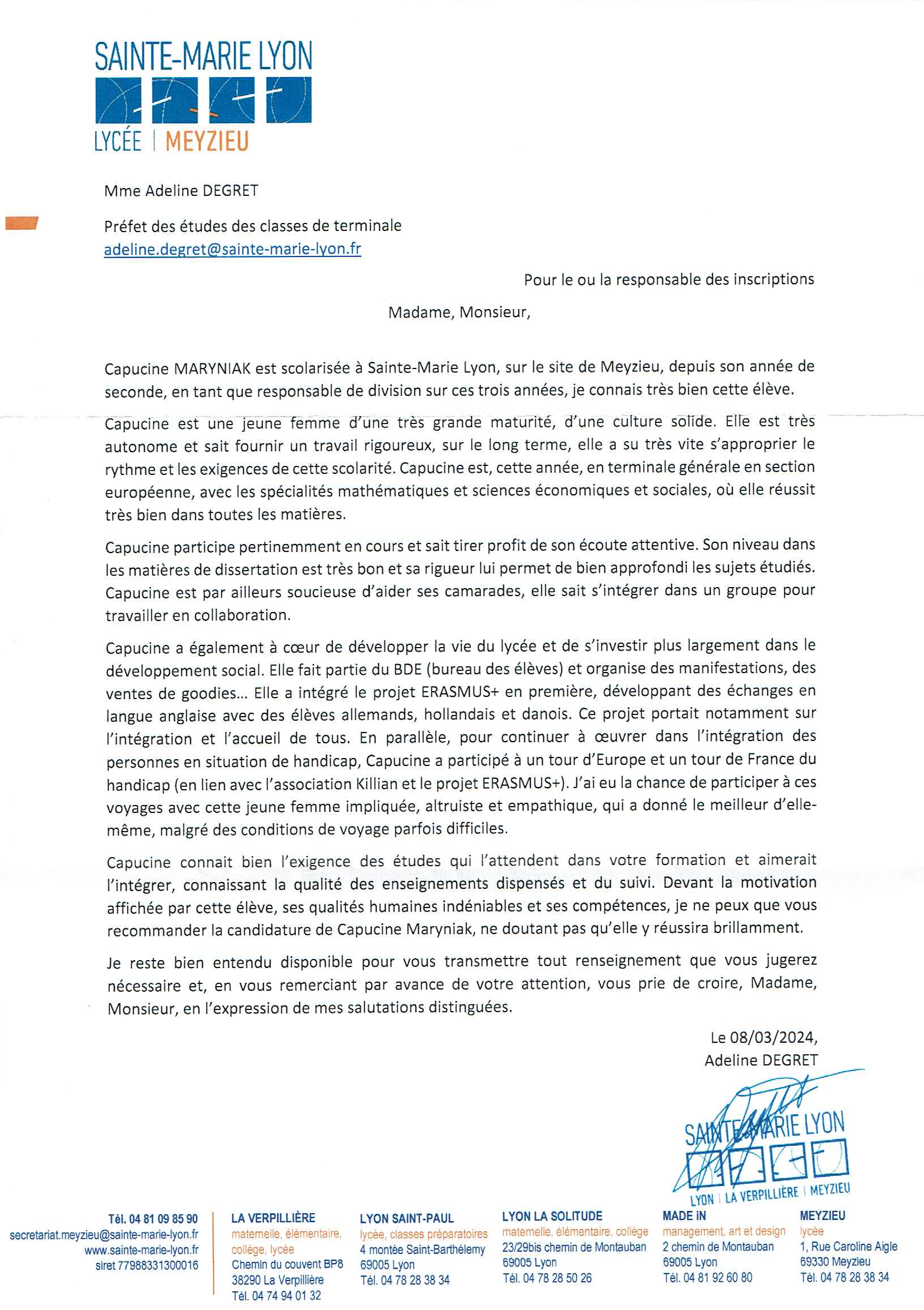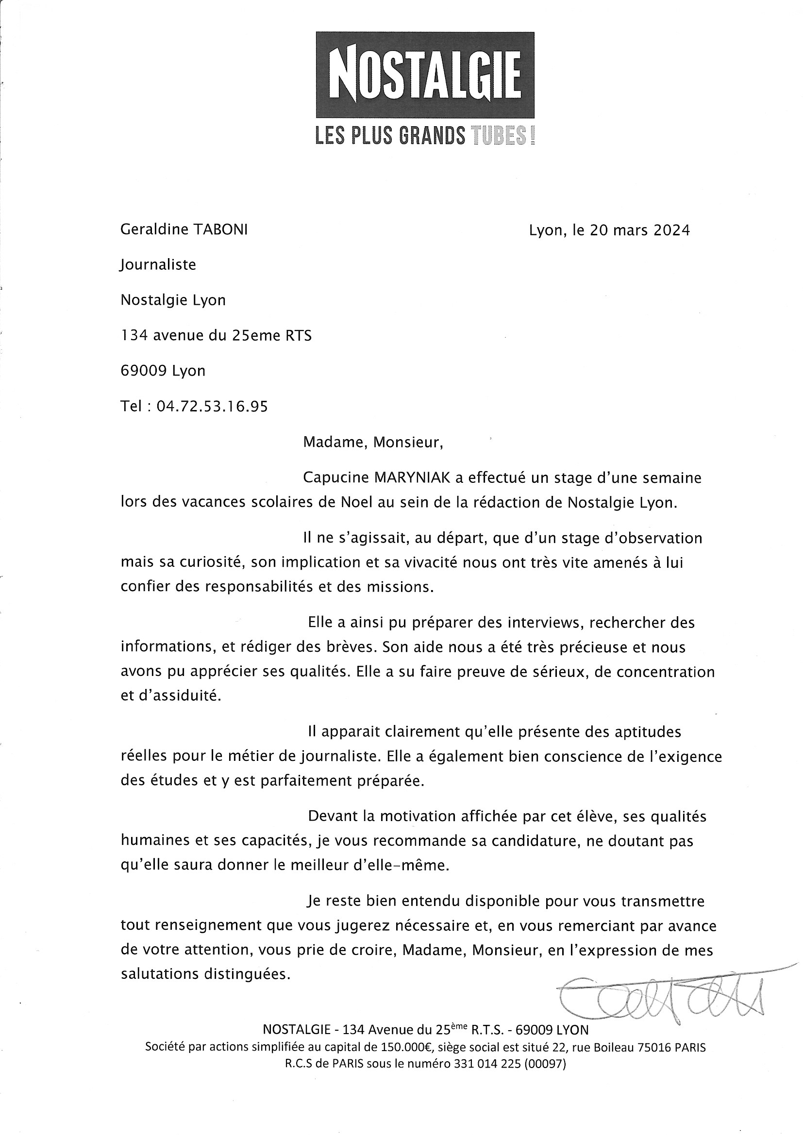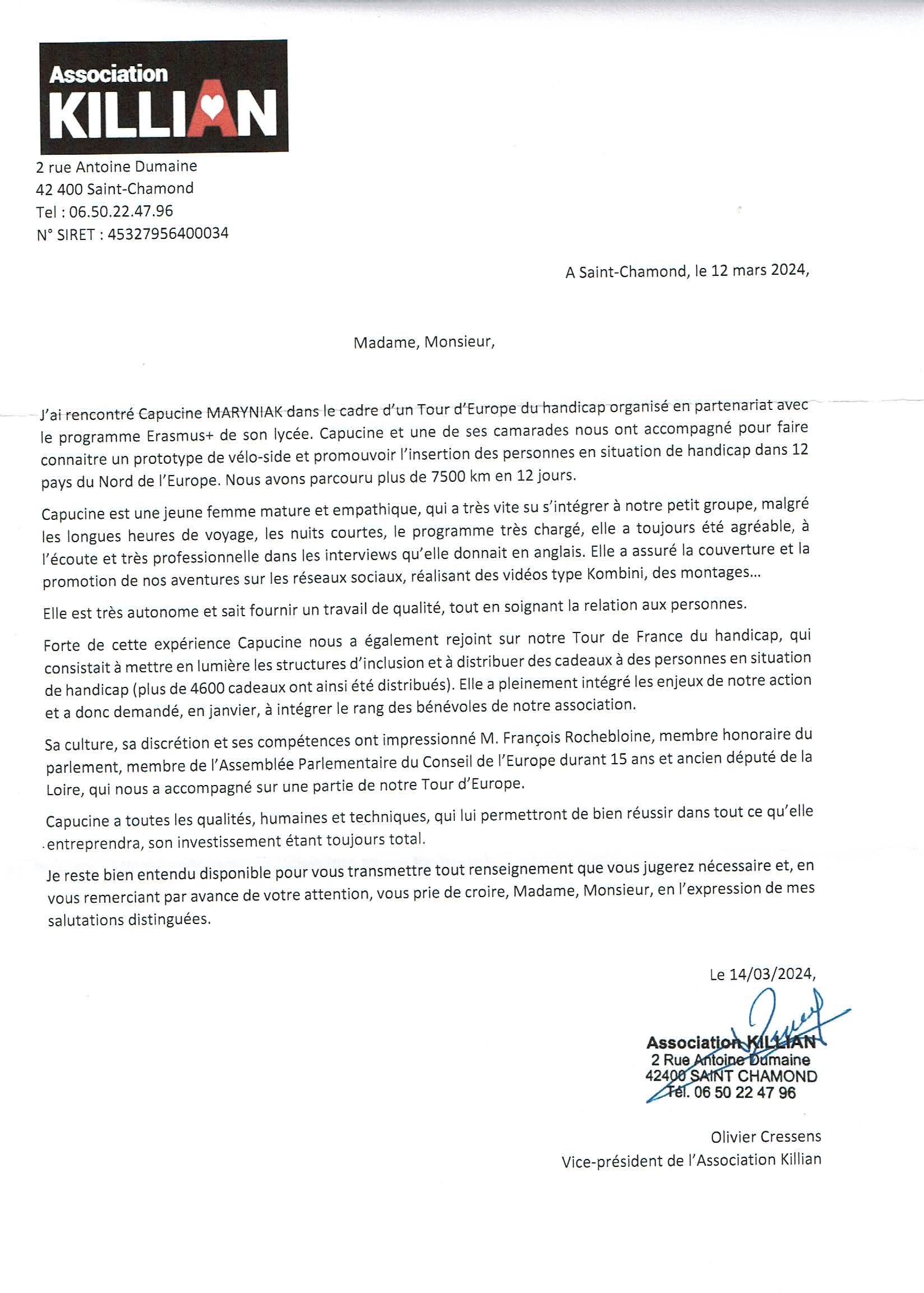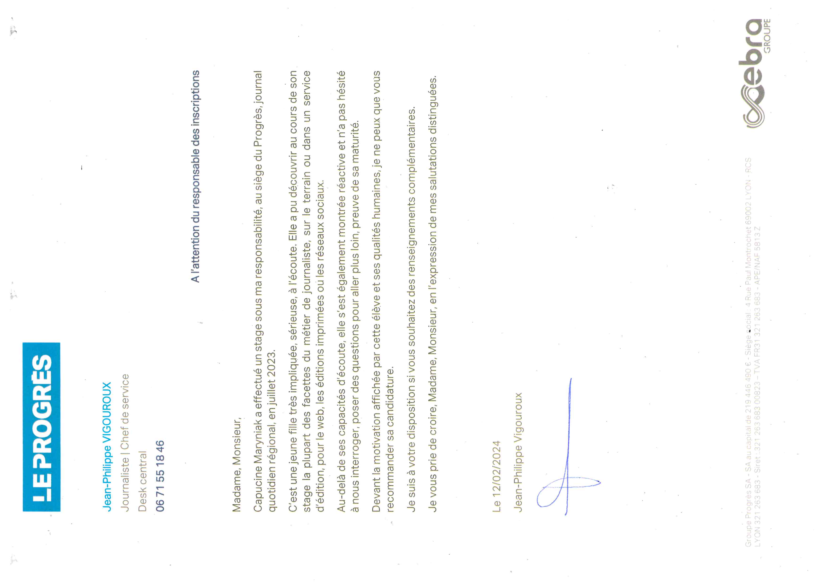 Cette envie est devenue une évidence après ce voyage et deux stages au cœur de la rédaction du Progrès à Lyon et en compagnie de la journaliste de Nostalgie. Je vous partage 4 recommandations : Madame Degret préfet des études de terminales de mon lycée, Monsieur Cressens vice-président de l’association Killian ; Madame Taboni journaliste chez Nostalgie à Lyon et Monsieur Vigouroux journaliste et chef de service au Progrès Lyon.